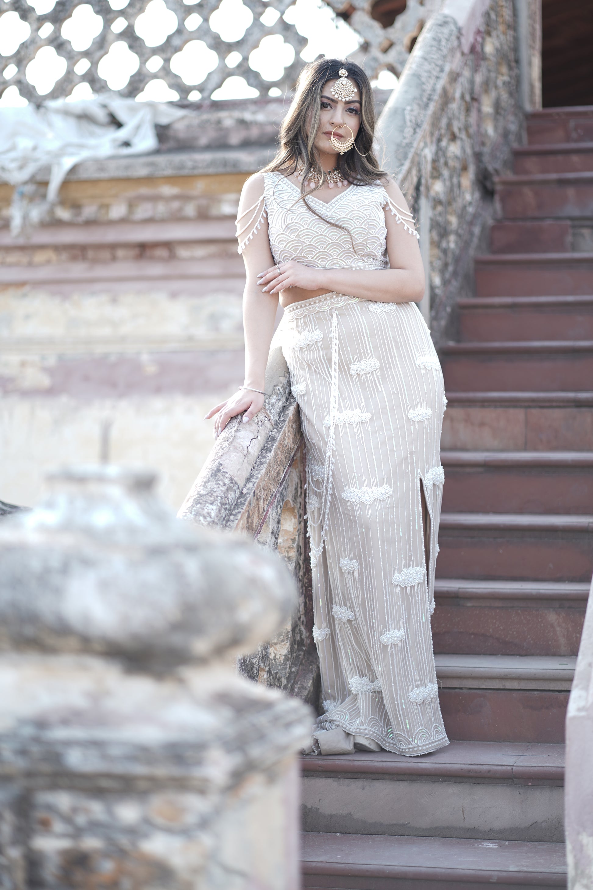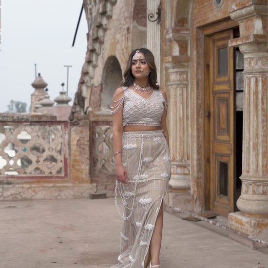 Ivory Tulle Pearl Embroidered Lehenga Set